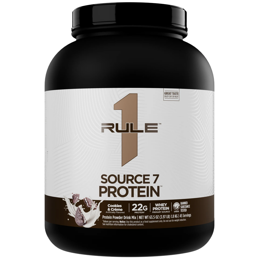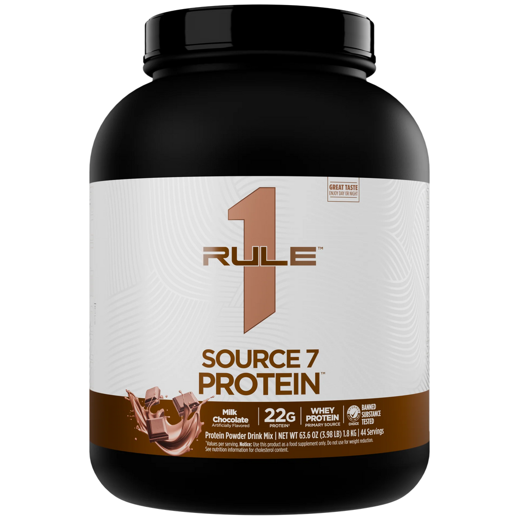 Rule One Source7 Protein features 7 premium protein sources in a versatile staged-release formula: whey protein isolate, whey protein concentrate, hydrolyzed whey protein, native whey protein isolate, micellar casein, milk protein isolate, and pea protein. This blend delivers 22g of high-quality protein per scoop with naturally occurring amino acids for anytime use.